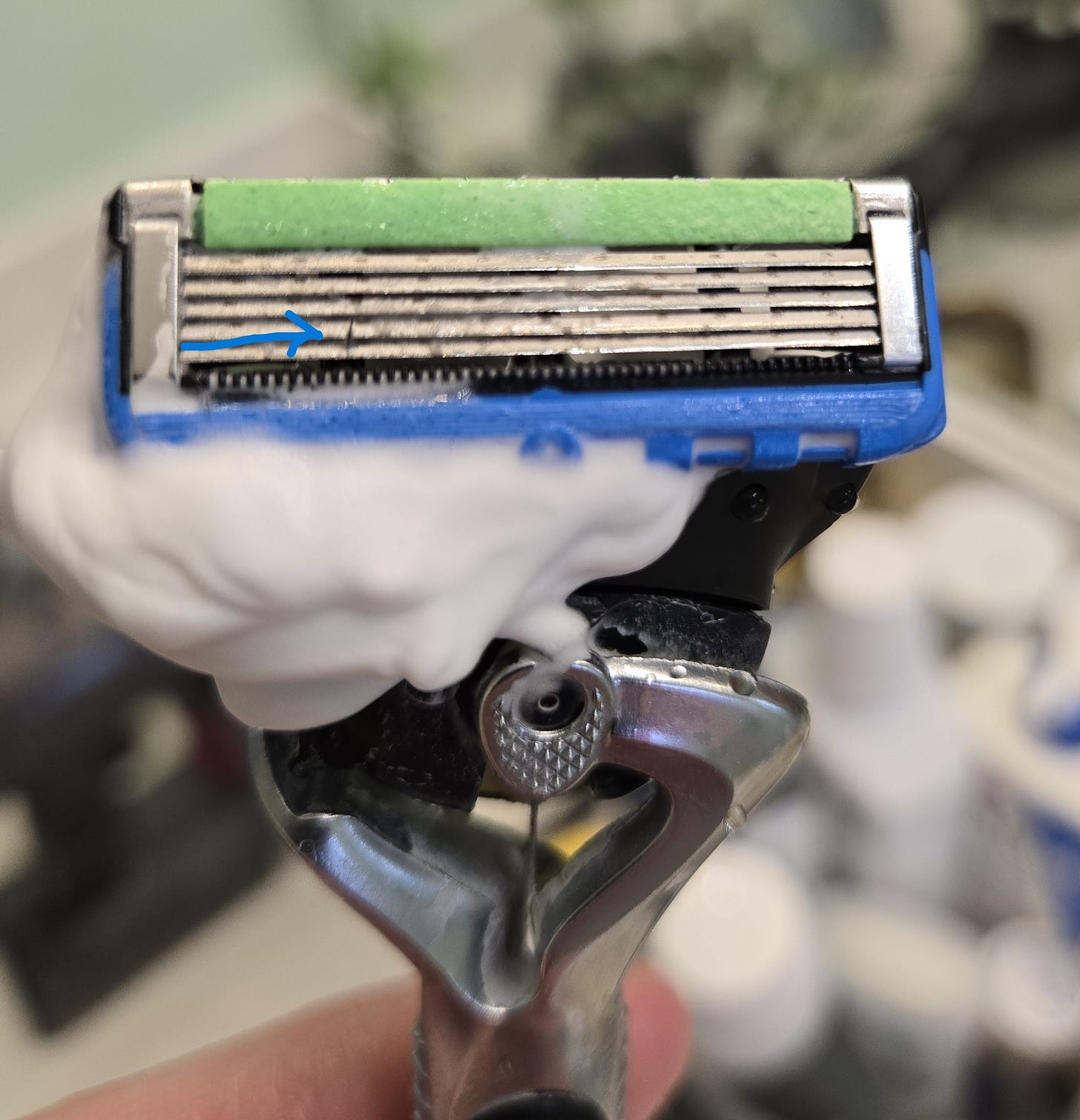 If you look closely at where the arrow points, you’ll see a hair. At first glance that might not seem to be a surprising thing to see on a razor blade mid shave, but the key thing is that it is lying on top of the razor blade, instead of underneath it. No such hairs showed up on my razor yesterday and we only had the one today, but that’s about normal for the tenth day after LHR.